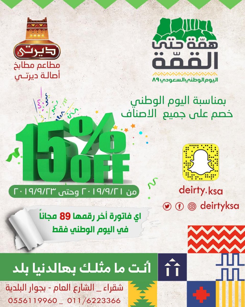صحيفة شقراء نت On Twitter خصم 15 علئ جميع الاصناف من مطاعم مطبخ اصالة ديرتي بشقراء بمناسبة اليوم الوطني 89 إعلانات الوشم واتس اب 0537001331 Https T Co Di7pxrvwkj